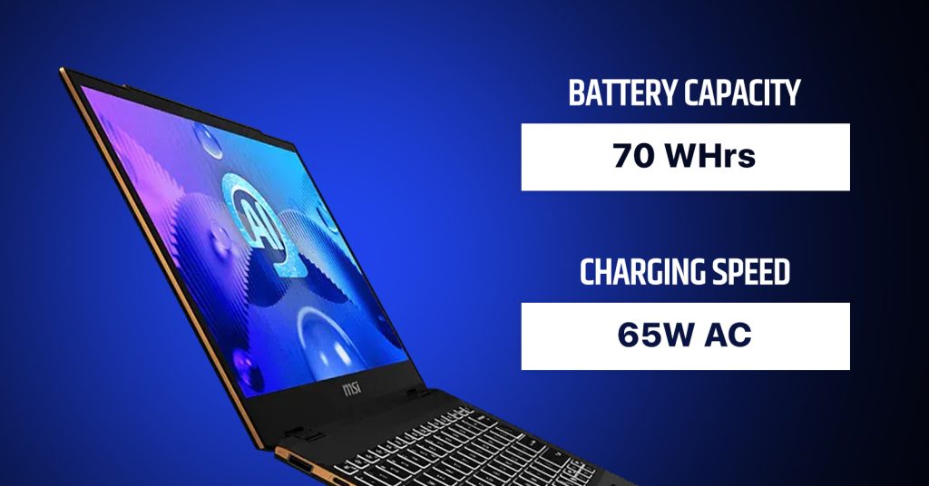 The MSI Summit E13 AI Evo A1MTG has a 65 W USB-C power adapter that goes with a 70 Wh battery. This configuration gives 24 hours of regular use including browsing, video calls and office. USB-C Power Delivery charging also provides extended charging opportunities using compatible chargers or power banks.